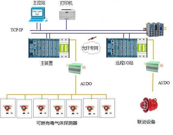 系統由安裝在現場的可燃/有毒氣體探測器和安裝在控制室內的控制單元、數據采集模塊、工作站等組成。通過數據采集模塊對現場檢測器實施數據采集,并通過通訊模件完成于操作員站或第三方系統(設備)之間的通訊,接受相關信息并傳遞實時數據。